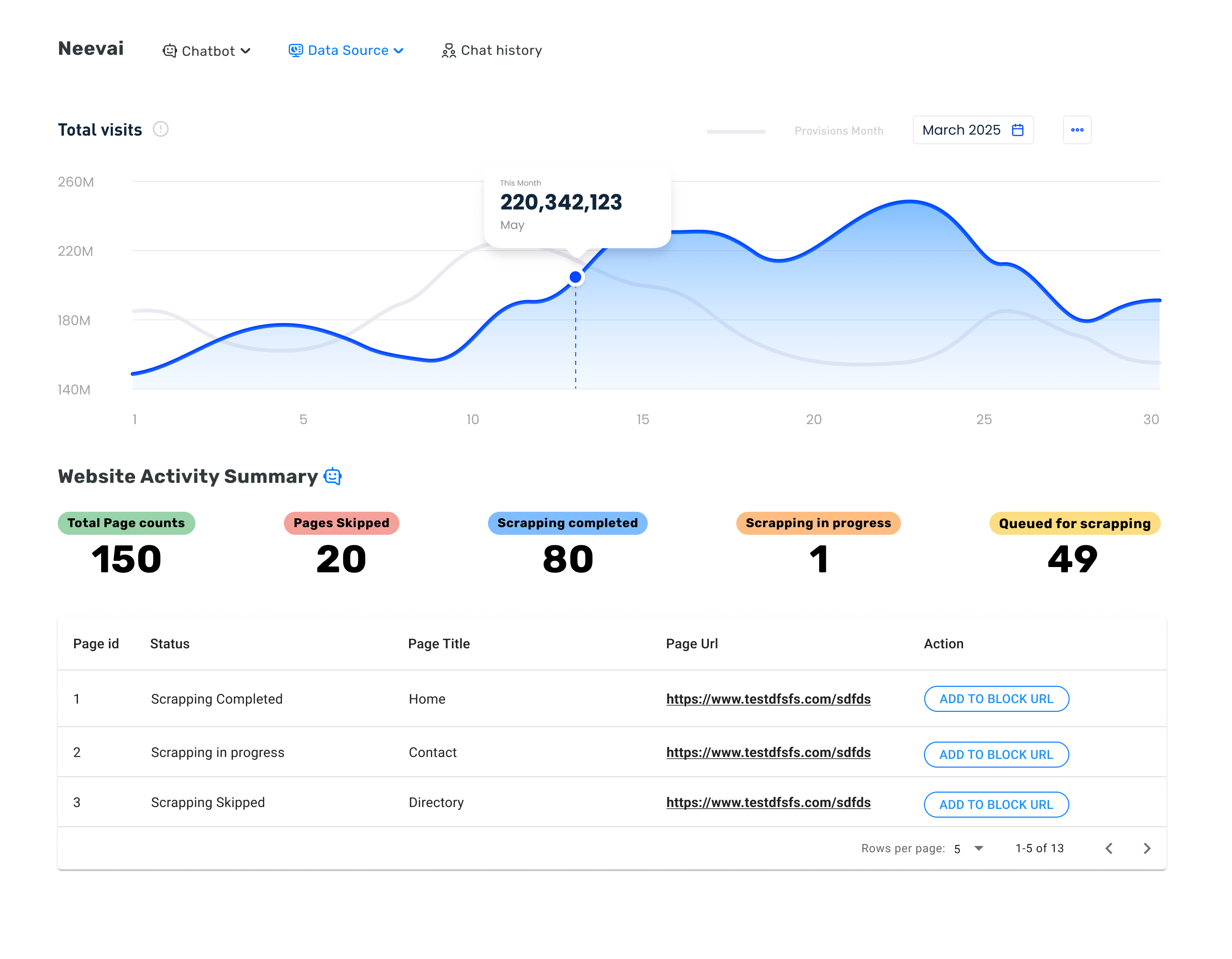 Neev’s AI algorithm will quickly learn from your data. In a matter of seconds, you’re ready to launch your first AI chat agent to your website.